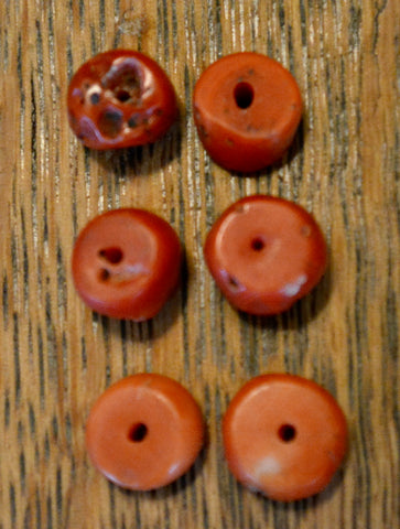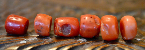 Nice grouping of 6 antique tibetan coral beads ranging in size from 9mm x 9mm to 8mm x 6mm.